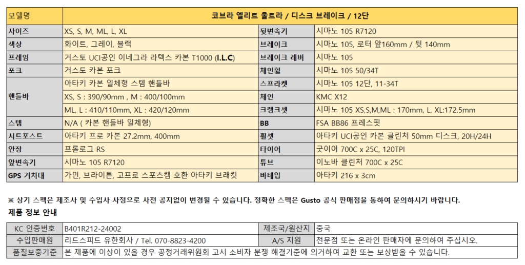 ※상기 스펙 및 가격은 제조사 및 수입사 사정으로 사전 공지없이 변경될 수 있습니다. 정확한 가격 및 스펙은 Gusto 공식 판매점을 통하여 문의하시기 바랍니다.