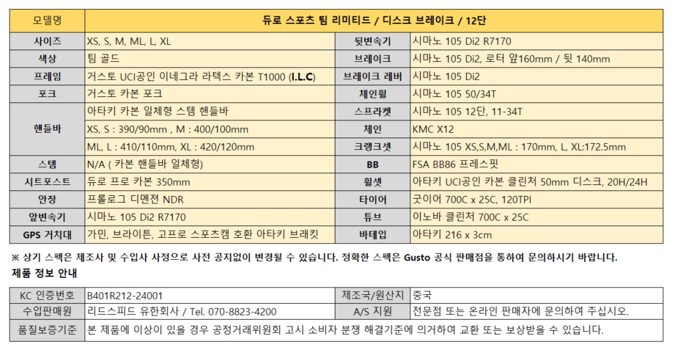 ※상기 스펙 및 가격은 제조사 및 수입사 사정으로 사전 공지없이 변경될 수 있습니다. 정확한 가격 및 스펙은 Gusto 공식 판매점을 통하여 문의하시기 바랍니다.